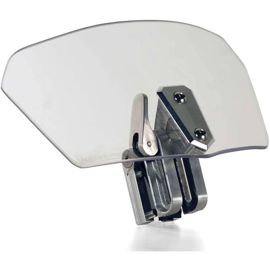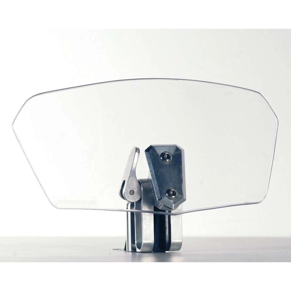 Spoiler universale trasparente da montare sui cupolini / parabrezza 12,5 x 25,0 cm (H x L); il sistema di ancoraggio in alluminio permette di regolare l’altezza e l’inclinazione dello stesso.