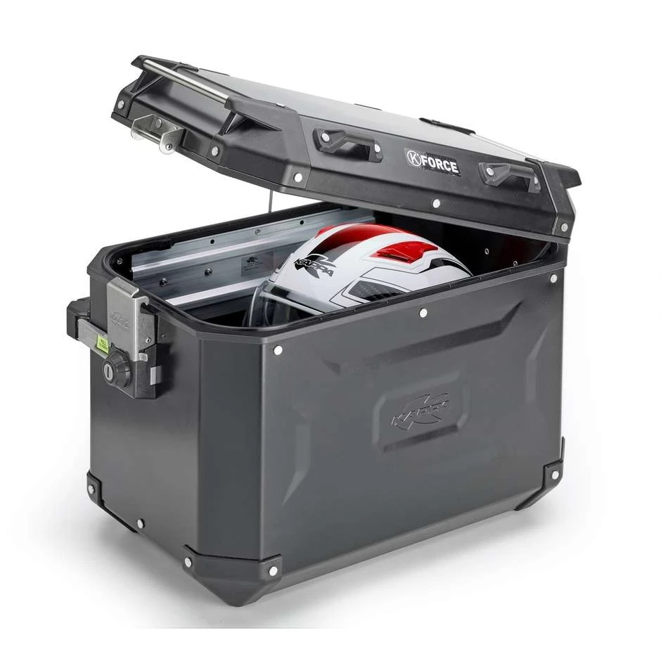 Le nuove valige K’Force rappresentano la naturale evoluzione delle K’Venture. Realizzate in Alluminio con trattamento meccanico per il rivestimento, cerniere di apertura/chiusura in acciaio Inox come anche epr i passacinghia. GLi Angoli della Valigia sono in tecnopolimero rinforzato che oltre a proteggere le estremità delle valige, le donano anche un aspetto decisamente più aggressivo.